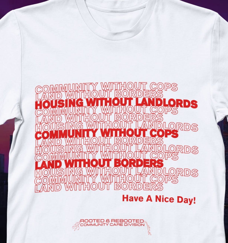 Festive lights. Human rights. No cops, no borders, no landlords. Bold red-and-white vinyl for the season — cozy, radical, unapologetic.